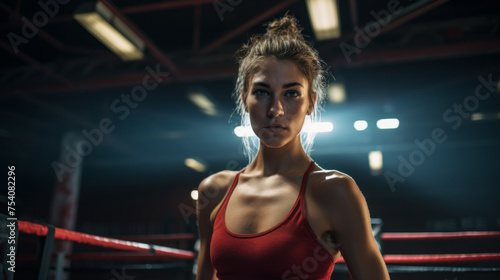 Fototapeta premium A young strong female boxer looks at the camera in the ring. Sports,...