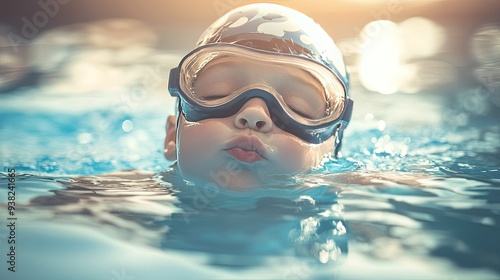 © Theeranan, Naklejka premium A young swimmer in a cap and goggles, kissing the water during a fun and educational swimming lesson.