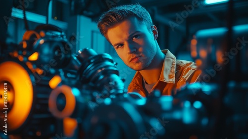 Fototapeta premium A young technician is focused on an intricate mechanical project. The vibrant...