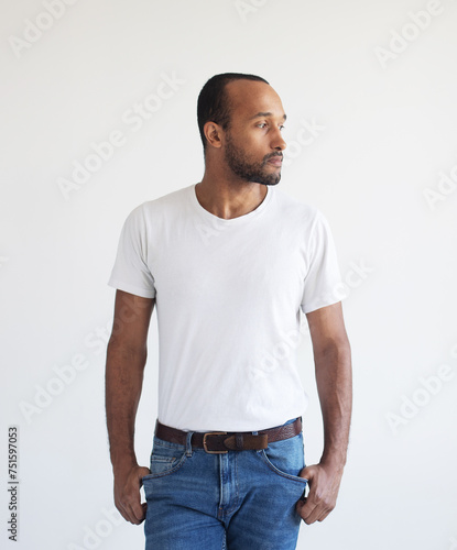 © Raisa Kanareva, Fototapeta premium A young unshaven man on a light gray background. Mixed race handsome male model.