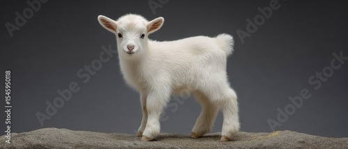 © Aventurine, Fototapeta premium A young white goat kid stands on a textured surface against a plain grey background.