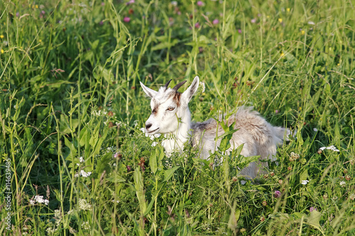 © nataba, Fototapeta premium a young white goat lying on a green meadow among the beautiful flowers