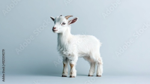 © efahardhani, Obraz premium A young, white goat with small horns stands facing left against a plain, light blue backdrop. The lighting is soft and diffused, creating a gentle mood.