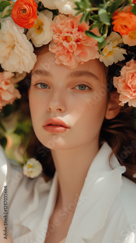 Naklejka premium A young White woman adorned with a crown of colorful flowers stands...