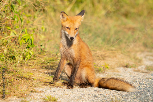 © _ _, Naklejka premium A young wild born brown and red fox sits at the side of the road while learning to hunt scavenge and survive on its own in summer heat after its mother was killed by nearby property owners