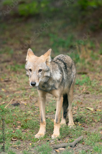 Obraz premium A young wolf cub, emaciated from hunger