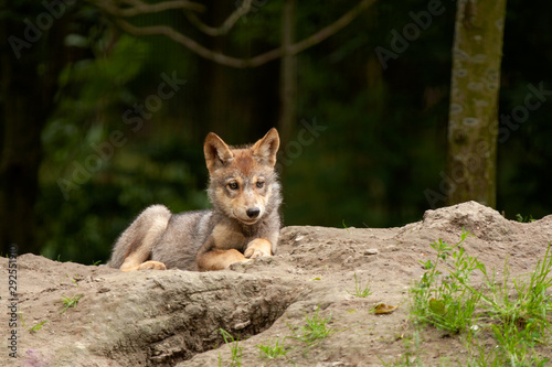 © dennis, Fototapeta premium A young wolf lying on the ground