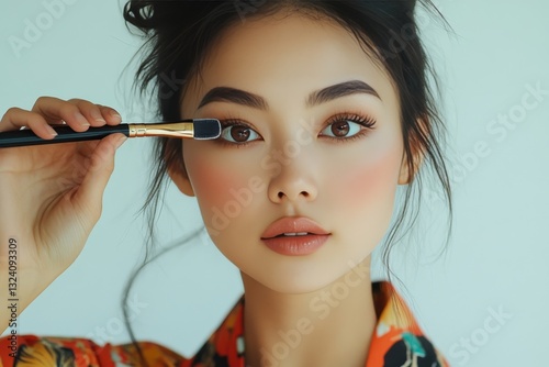 © Lens Orbits, Obraz premium a young woman applies eye shadow with a brush.