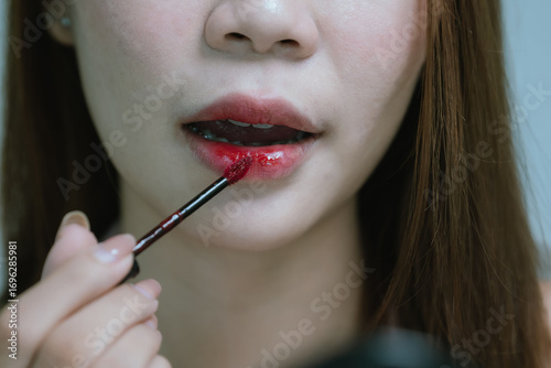 © Worawi, Obraz premium A young woman applies makeup with a brush, smiling confidently, showcasing flawless skin, beauty, elegance, skincare routine, and radiant facial appearance.