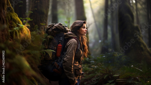 © SevketMertGunek, Fototapeta premium a young woman backpacker in the woods.