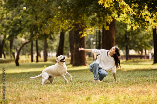 © LIGHTFIELD STUDIOS, Obraz premium A young woman dressed for autumn enjoys a playful moment with her dog in a beautiful park.