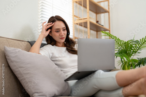 © Wasana, Fototapeta premium A young woman enjoys a leisurely day, comfortably using her laptop while reclining on a couch at home.