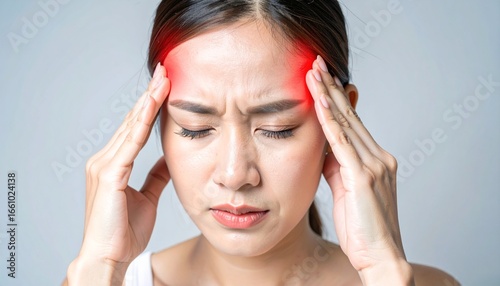 © Ramavanjava, Fototapeta premium A young woman experiencing a headache, holding her temples, with a red highlighted area.