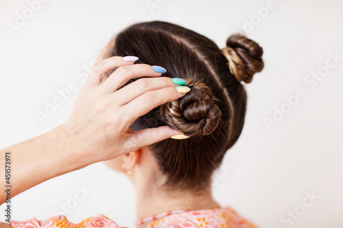 Naklejka premium A young woman fixes her hair bun. She wears rainbow gradient manicure.