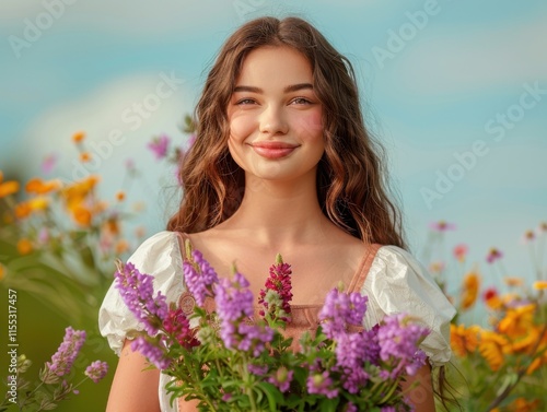 © neatlynatly, Fototapeta premium A young woman happily poses outdoors surrounded by vibrant blooming flowers, with blue skies in the background, creating a cheerful and lively spring atmosphere.