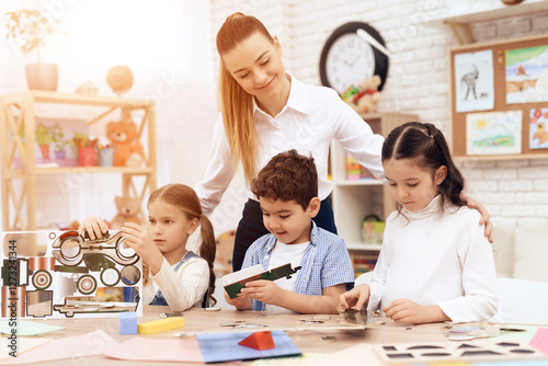 Fototapeta premium A young woman helps children fold parts from cardboard. This is their teacher. They have a lesson.