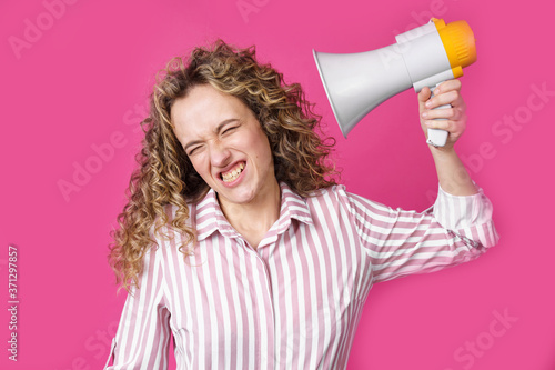 © Dzmitry, Naklejka premium A young woman holds a screaming megaphone in her hands, which is aimed at her face. Isolated pink background.