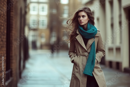 Fototapeta premium A young woman in a beige trench coat and teal scarf strolls down a city street, windswept hair adding to her stylish autumn look.