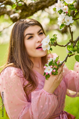 © czamfir, Fototapeta premium a young woman in a pink dress posing next to a blossoming apple, spring portrait.