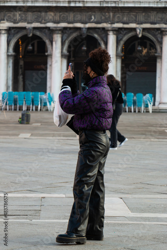 © Timothy, Naklejka premium A young woman in black faux leather pants and a black and purple jacket.