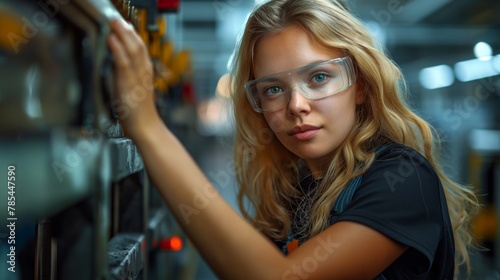 © Goolya, Fototapeta premium A young woman in protective glasses is conducting experiments in the laboratory, doing scientific researc