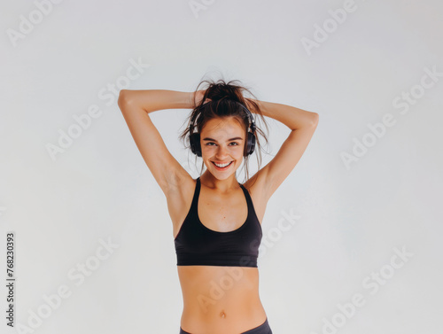 © Restyler, Fototapeta premium A young woman in sportswear and headphones smiles and listens to music. Active lifestyle.
