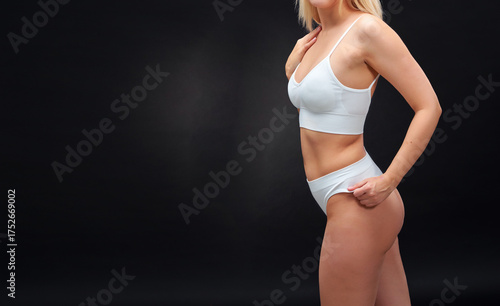 Fototapeta premium A young woman in white underwear is standing in a dark room. Her figure looks toned and athletic.