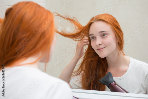 © Olga, Fototapeta premium a young woman is drying her hair