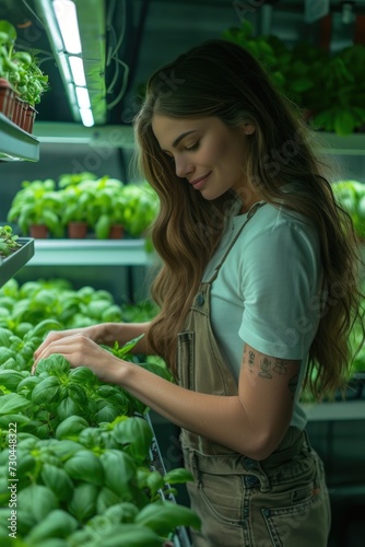 Obraz premium a young woman is growing fresh basil in an indoor farm