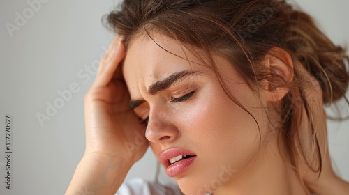 Naklejka premium A young woman is holding her head and looks like she is in pain.