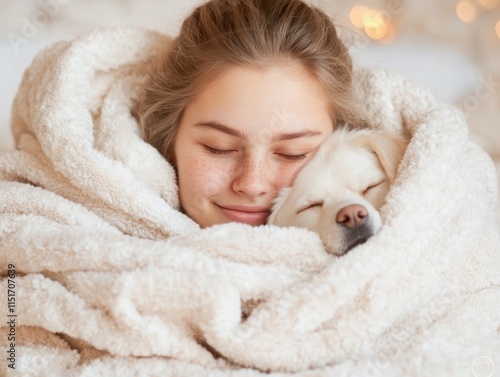 © pisan, Fototapeta premium A young woman is wrapped in a fluffy white blanket, her eyes closed, while cuddling a golden retriever, bathed in the soft glow of fairy lights reminiscent of the warm feeling of a homemade blanket