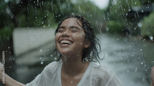 Obraz premium A young woman joyfully embraces a rain shower, her radiant smile capturing...