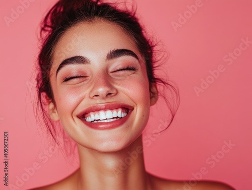 Fototapeta premium A young woman laughing and smiling brightly, against a pink background.