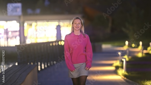 Fototapeta premium A young woman leisurely strolls along a beautifully illuminated waterfront...