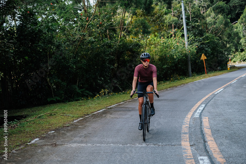 © Jonathan De Guzman, Fototapeta premium A young woman riding her bicycle in the mountains.
