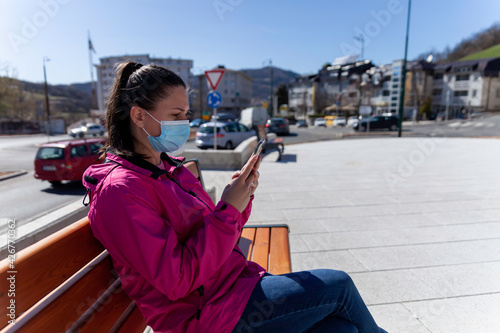 © Mirnes, Fototapeta premium A young woman sits in a park bench alone and uses a smartphone. Virus pandemic times