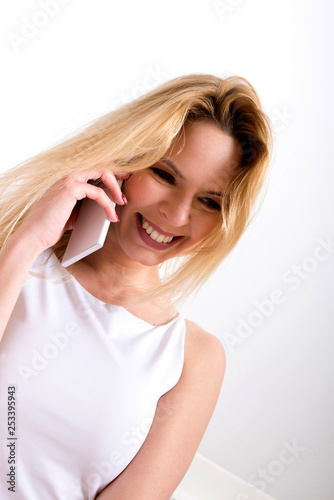 © Spectral-Design, Fototapeta premium A young woman sitting on a bed and talking on her phone