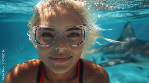 © sommersby, Naklejka premium A young woman smiles while snorkeling, enjoying the close encounter with a shark in a vibrant underwater environment