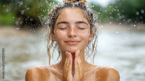 © JO BLA CO, Fototapeta premium A young woman stands in water with her eyes closed, embracing the tranquility of nature. Water droplets cascade around her, highlighting a joyful and peaceful moment outdoors