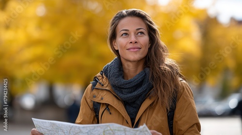 © SerPak, Naklejka premium A young woman stands outdoors in an autumn landscape, looking at a map with a thoughtful expression. The scene is vibrant with yellow leaves.