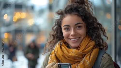 Fototapeta premium A young woman stands outside on a chilly day, holding her phone and smiling warmly, dressed in a cozy scarf and stylish winter clothing.