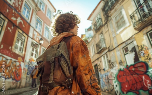 Fototapeta premium A young woman wearing a backpack and an orange jacket walks down a street with graffiti on the walls