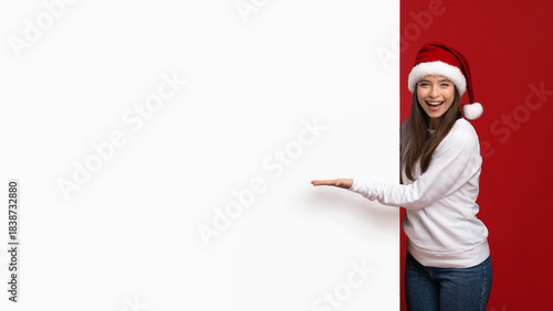 © Prostock-studio, Obraz premium A young woman wearing a Santa hat and white sweater stands beside a bright red wall, smiling joyfully while presenting a blank space. The festive atmosphere enhances her cheerful spirit.