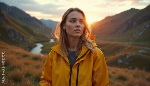 © schiers_images, Naklejka premium A young woman wearing a vibrant yellow jacket standing in a picturesque mountain valley during sunset, surrounded by dramatic scenery and a peaceful wilderness environment.
