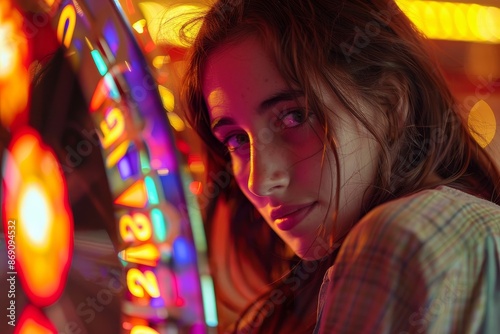 © Iftikhar alam, Obraz premium A young woman with a look of anticipation standing next to a ferris wheel at an amusement park, A woman with a look of anticipation spinning the wheel at a game of fortune