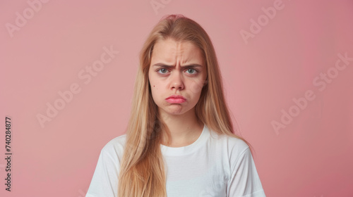 Fototapeta premium A young woman with a puzzled expression, featuring blonde hair and freckles, against a pink background.