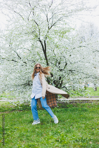 © DSMT, Naklejka premium A young woman with blond hair enjoys a blooming spring garden. Travel, spring break. Fashionable style. A woman in sunglasses and a beige trench coat runs through a flowering park. Selection focus