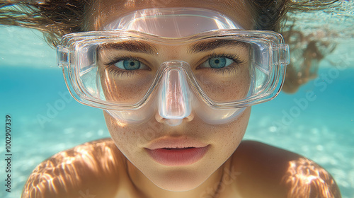 Fototapeta premium A young woman with bright blue eyes, wearing transparent goggles, embraces the beauty of underwater life in a stunning ocean environment