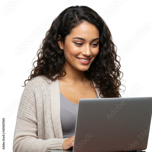 © shahida , Naklejka premium A young woman with curly dark hair smiling while looking at her laptop screen isolated on transparent background