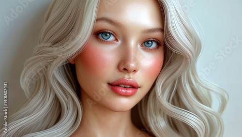 Fototapeta premium A young woman with flowing platinum blonde hair and delicate, rosy cheeks, exuding ethereal beauty against a soft, neutral backdrop